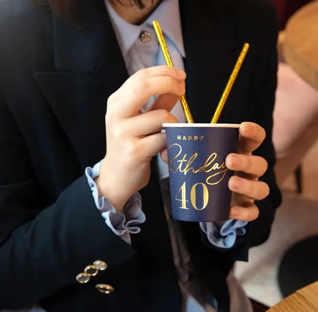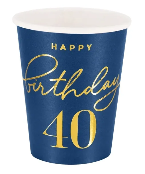 Zestaw wyjątkowych, granatowych kubeczków ze złotym napisem happy birthday 40. Idealnie sprawdzą się podczas imprezy urodzinowej. Dzięki swojej kolorystyce prezentują się bardzo elegancko i świetnie sprawdzą się w kompozycji ze złotymi ozdobami oraz serwetkami i talerzykami w tym samym motywie. Dodatkową zaletą użycia takich kubeczków jest fakt, iż po imprezie wystarczy je wyrzucić, a w zlewie nie będzie czekała na nas sterta naczyń.