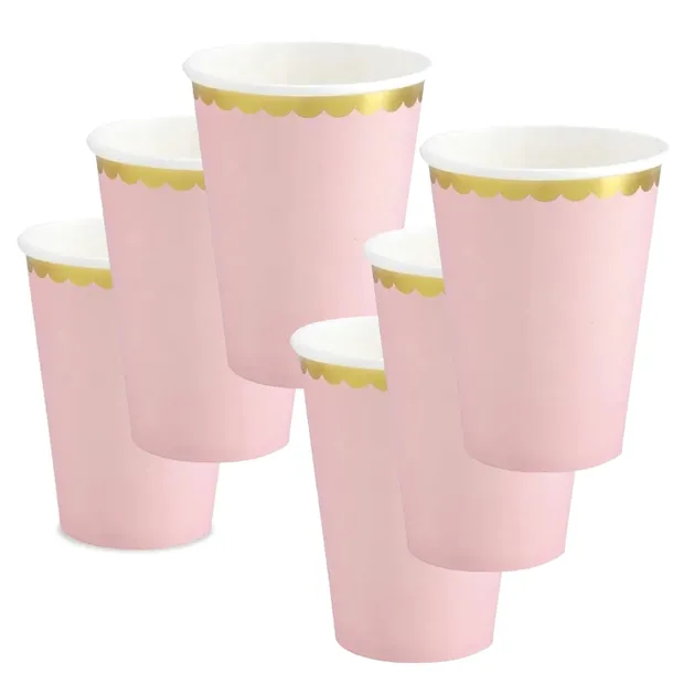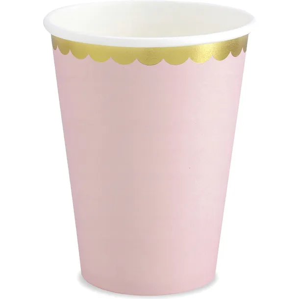 Kubeczki papierowe w kolorze jasnoróżowym ze złotymi metalizowanymi brzegami, pojemność ok. 220 ml. Kubki na napoje zawierają oznaczenia wymagane przez Rozporządzenie wykonawcze Komisji (UE) 2020/2151 z dnia 17 grudnia 2020 r. ustanawiające zasady dotyczące zharmonizowanych specyfikacji w odniesieniu do oznakowania produktów jednorazowego użytku z tworzyw sztucznych wymienionych w części D załącznika do dyrektywy Parlamentu Europejskiego i Rady (UE) 2019/904 w sprawie zmniejszenia wpływu niektórych produktów z tworzyw sztucznych na środowisko. Produkt zawiera etykietę wyłącznie w języku polskim, niemieckim, czeskim, francuskim, niderlandzkim, słowackim, słoweńskim i bułgarskim.(1 op. / 6 szt.)