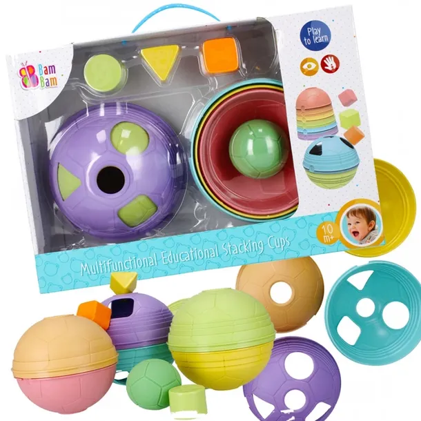 Kubeczki Sorter Bam Bam to perspektywa długich godzin zabawy malucha na układaniu, burzeniu, przekładaniu oraz próbach dopasowania odpowiedniej figury geometrycznej do odpowiadającego im otworu w jednym z kubeczków.