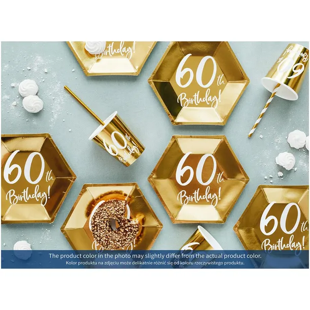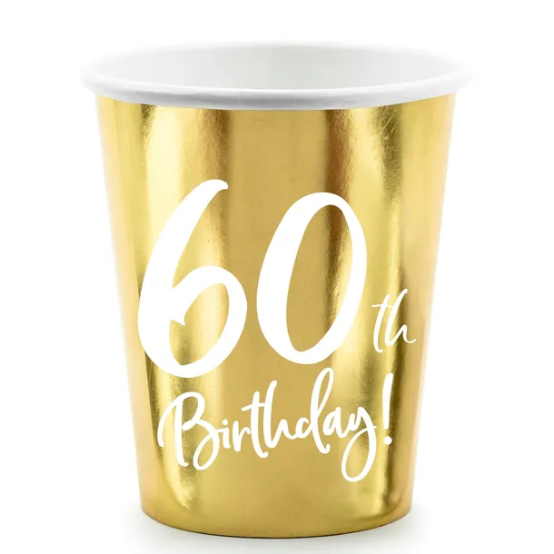 Prezentowane kubeczki urodzinowe zostały wyprodukowane z wysokiej jakości lustrzanego złotego papieru, ozdobionego białym urodzinowym napisem 60th Birthday!