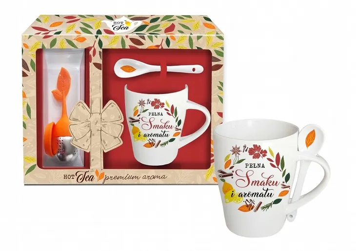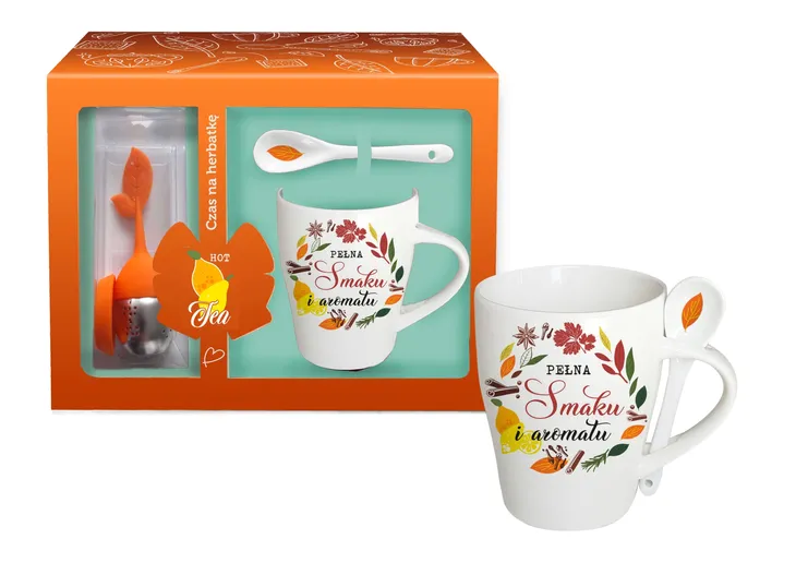 Porcelanowy kubek z zaparzaczem oraz łyżeczką z serii Hot tea 2022 marki Tułowice. Kubek o pojemności 350 ml (pojemność liczona po rant kubka). Kubek ozdobiony motywem aromatycznych przypraw do herbaty jak cytryna, cynamon, pomarańcza oraz napisem: "Pełna smaku i aromatu" na białym tle. Jasna kolorystyka nadaje linii elegancji.