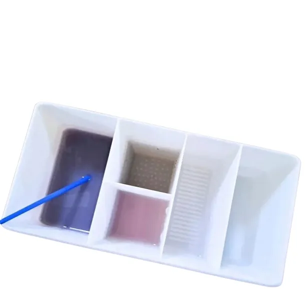 Kiedy zwykły kubek szybko mętnieje, ten pojemnik wprowadza porządek dzięki oddzielnym komorom. Strefy czyszczące z wypustkami i żebrowaniem delikatnie, ale skutecznie usuwają resztki farby z włosia. Stabilna, prostokątna forma dobrze leży na biurku lub przy sztaludze. Sprawdzi się przy akrylach, akwarelach, gwaszu i tuszach, a także w modelarstwie. Wykonany z trwałego tworzywa, szybko się płucze i jest gotowy do kolejnej sesji.