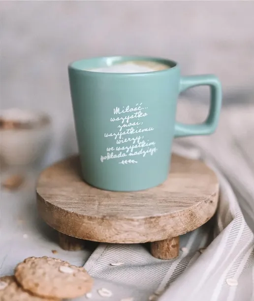 Ten wyjątkowy kubek o pojemności 300ml w spokojnym odcieniu zieleni nie tylko uprzyjemni Ci poranki, ale również przypomni, że miłość jest kluczem do głębokiej harmonii i zrozumienia. Hasło „Miłość” przypomina nam, że kochając i wierząc, tworzymy piękną przestrzeń dla relacji, zarówno z Bogiem, jak i z innymi ludźmi.