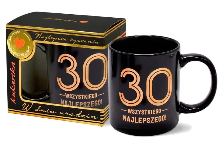 Kubek Premium na 30. urodziny Q 1063Kubki Premium Kukartka to doskonały pomysł na prezent - mają elegancką czarno-złotą kolorystykę, oryginalne wzory, są zdobione złoceniem i zapakowane w estetyczne pudełeczko.Cechy szczególne:Typ produktu: kubek na prezent,Materiał: porcelana,Pojemność: 300mlOpakowanie: ozdobny kartonik,Okazja: urodzinyPrzeznaczony do kontaktu z żywnością. Można myć w zmywarce. Nieodpowiednie dla dzieci w wieku 0-3