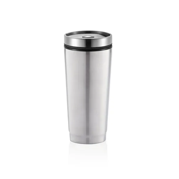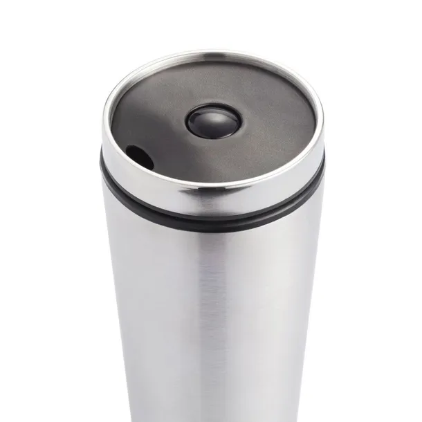 Kubek termiczny 350 ml, stal nierdzewna na zewnątrz, wnętrze z PP, wieczko z przyciskiem zamykającym zapobiegający wylaniu, nie wymaga obsługi oburącz, szczelny, klasa termiczna: D