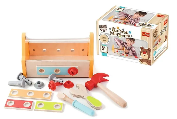 Kuferek Majsterek jest wykonany z jasnego naturalnego, atestowanego drewna oraz pomalowany nietoksycznymi farbami. Dołączono do niego drewniane deseczki i narzędzia (młotek, klucz płaski, śrubokręt) oraz plastikowe akcesoria (śruby, gwoździe i nakrętki). Ten wspaniały zestaw sprawi, że chłopiec będzie mógł wcielić się w rolę majsterkowicza i zacząć naprawiać, przykręcać, montować i uderzać młotkiem do woli!