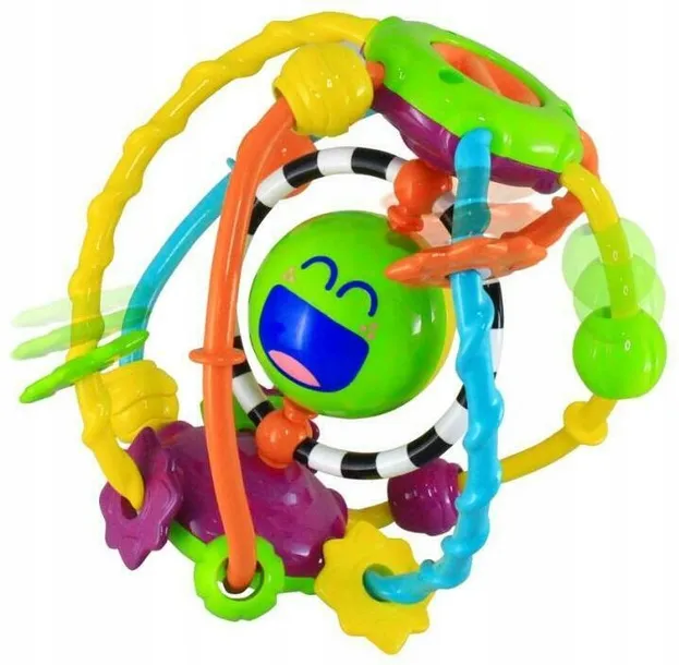 Zabawka wspierająca rozwój sensoryczny malucha. Kula składa się z kolorowych linek oraz koralików o zróżnicowanej fakturze, stymulujących zmysł dotyku i wzroku. Na szczycie kuli znajduje się element, który przy przekręcaniu wydaje zabawny, terkoczący dźwięk.Zabawka przeznaczona dla dzieci od 6 miesiąca ż zabawki:terkotanieruchome koralikiwiek: 6 m+