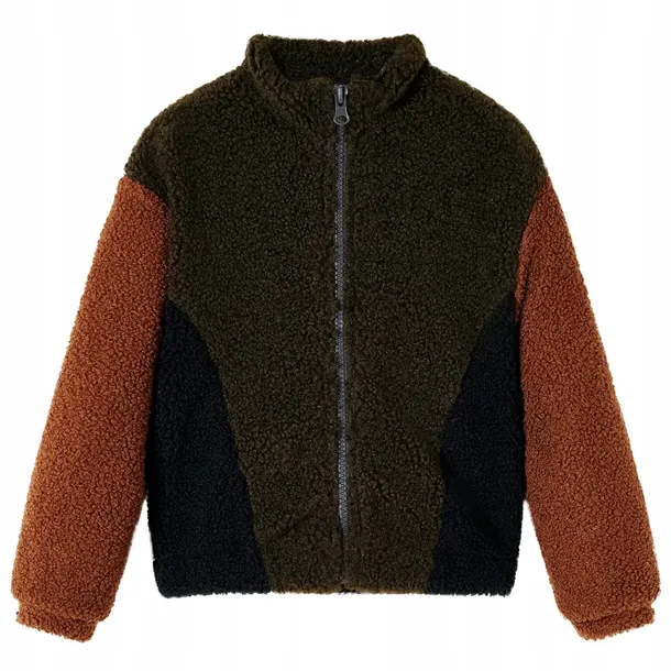 Ta dziecięca kurteczka ma stójkę, długie rękawy i zapięcie na zamek błyskawiczny. Prezentuje kolorowy, wesoły patchwork w odcieniach khaki, camelu i czerni. Kurtka dla dzieci wykonana jest w 100% z poliestru, dzięki czemu jest ciepła i wygodna.