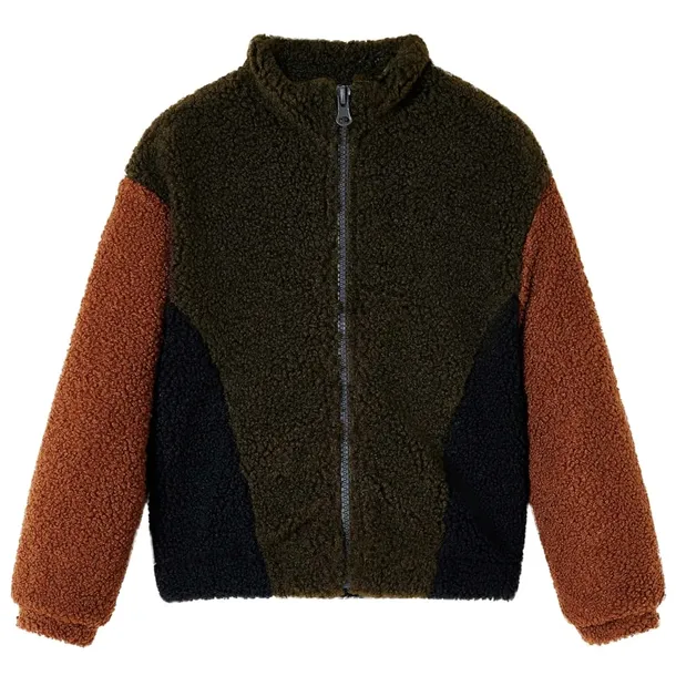 Ta dziecięca kurteczka ma stójkę, długie rękawy i zapięcie na zamek błyskawiczny. Prezentuje kolorowy, wesoły patchwork w odcieniach khaki, camelu i czerni. Kurtka dla dzieci wykonana jest w 100% z poliestru, dzięki czemu jest ciepła i wygodna.