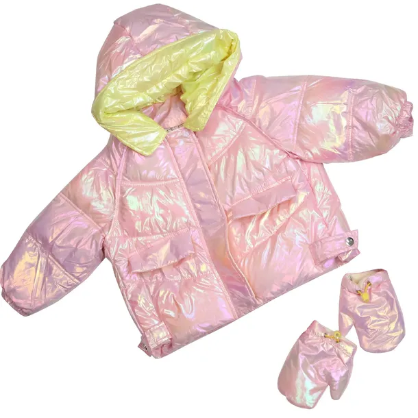 Kurtka wykonana z połyskującej tkaniny z holograficznym efektem w kolorze różowym. Pięknie się mieni w zależności od padania światła w kolor złoty.