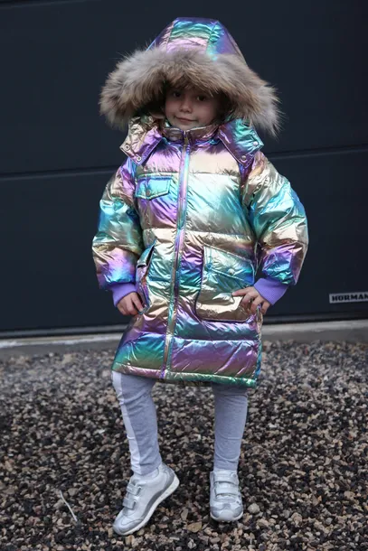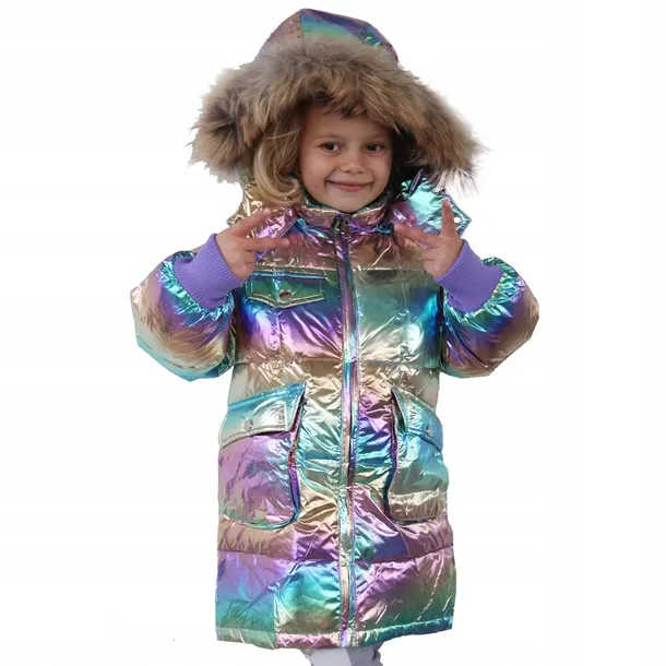 Kurtka wykonana z połyskującej tkaniny z holograficznym efektem. Pięknie się mieni w zależności od padania światła.