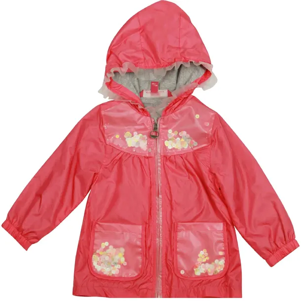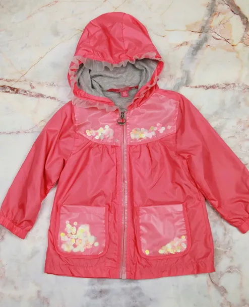 Kurtka zasuwana na zamek błyskawiczny. Transparentne wstawki z cekinami na górze kurtki oraz przy kieszeniach. Z przodu dwie kieszonki. Ściągacze przy rękawach.