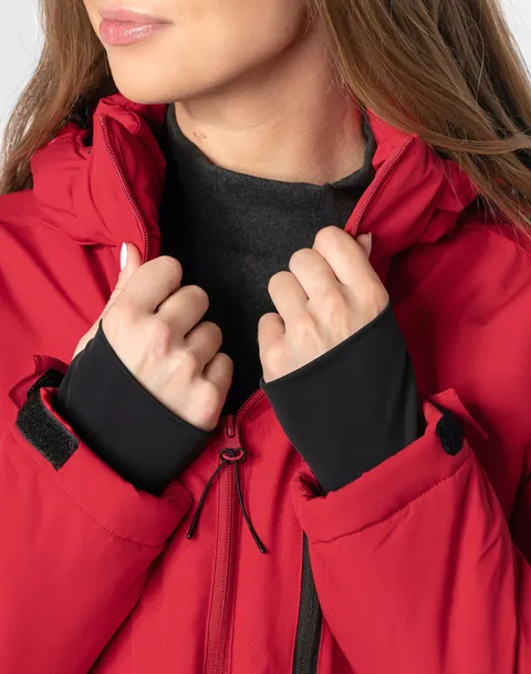 - Dwie zasuwane na kryte wodoodporne zamki kieszenie na SKIPASS na lewym i prawym rękawie kurtki