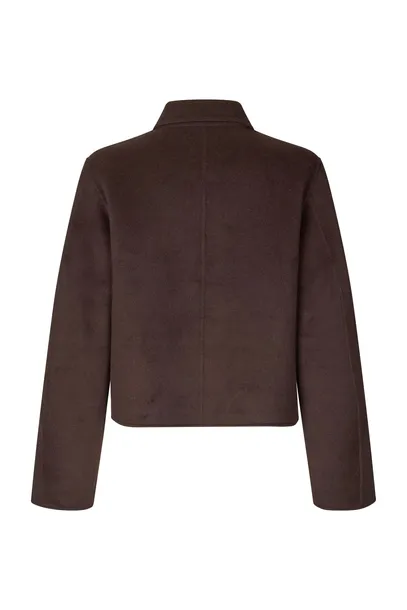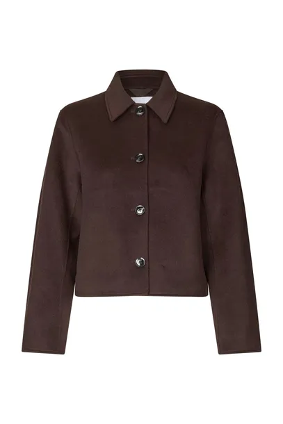 Kurtka Saholly od Samsøe. Krótka, klasyczna kurtka w głębokim brązowym kolorze, która doda Twojej garderobie wyrafinowanego charakteru. Kurtka Saholly ma prosty i nowoczesny krój ze spiczastymi kołnierzami, dyskretnymi kieszeniami bocznymi i szerokimi rękawami. Wykonana jest z mocnej, filcowanej mieszanki wełny z domieszką materiałów z recyklingu – idealnej na chłodne dni. Kurtka zapinana jest na cztery guziki z przodu i równie dobrze prezentuje się ze spodniami garniturowymi, jak i na sukience.