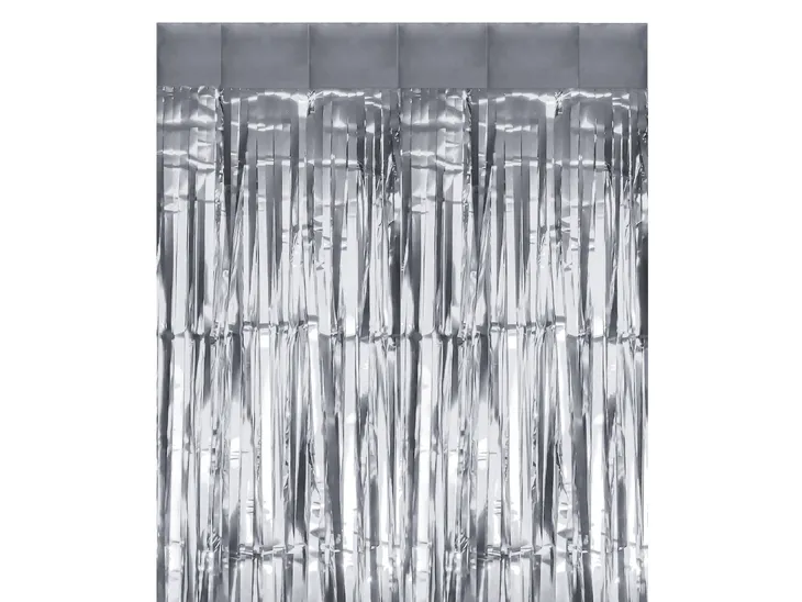 Dekoracja wisząca kurtyna foliowa na drzwi w kolorze srebrnym metalizowanym.Wymiary: szer. 100 x wys. 200 cm.Opakowanie: 1 szt.
