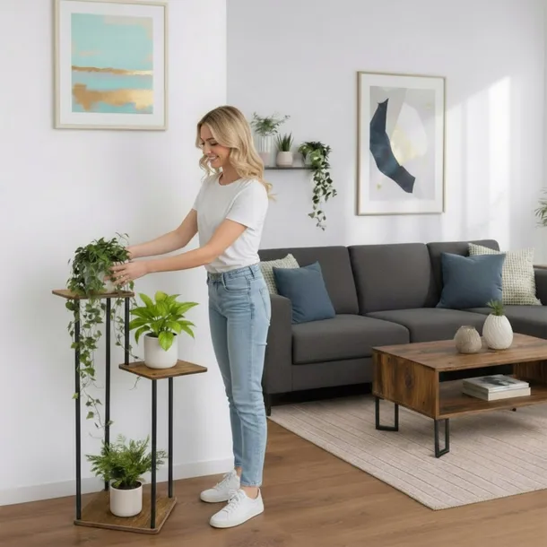 Kwietnik Tomas Rustic to połączenie stylu i funkcjonalności, które idealnie sprawdzi się do efektownej ekspozycji roślin. Ułatwia organizację przestrzeni, pozwala wyeksponować ulubione kwiaty i wprowadza do wnętrza ciepłą, loftowo-rustykalną atmosferę. Stabilna konstrukcja oraz trzy poziomy umożliwiają ustawienie większej liczby roślin bez zajmowania dużej powierzchni podłogi, a zestawienie czarnej stali z płytą w kolorze postarzanego dębu sprawia, że kwietnik pełni również funkcję dekoracyjną.