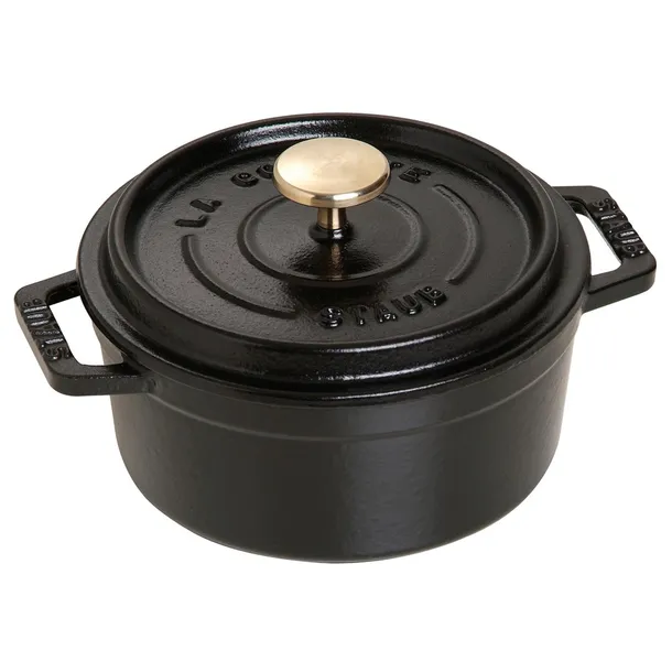 Idealne naczynie do duszenia potraw. Dzięki specjalnej pokrywce potrawa jest doskonale nawilżona. Garnek żeliwny Staub ma również inne zastosowania – można w nim gotować, smażyć, a nawet piec w wysokich temperaturach. Duże wygodne uchwyty po obu stronach garnka oraz duża gałka pokrywki umożliwiają mocny chwyt nawet w rękawicach kuchennych. Garnki żeliwne można stosować na wszystkich źródłach ciepła, również na kuchni indukcyjnej. Wewnętrzna powłoka non – stick uniemożliwia przywieranie potraw. Zewnętrzna kolorowa emalia zapewnia trwałość i łatwość czyszczenia naczynia, a także nadaje naczyniu niepowtarzalny wygląd. Pięknie prezentuje się na stole podczas serwowania potraw. WYMIARY Średnica: 12 cm Średnica dna: 10.2 cm Wysokość (bez pokrywki): 5.5 cm Wysokość: 8.7 cm Długość: 16 cm Pojemność: 400 ml Masa: 1.