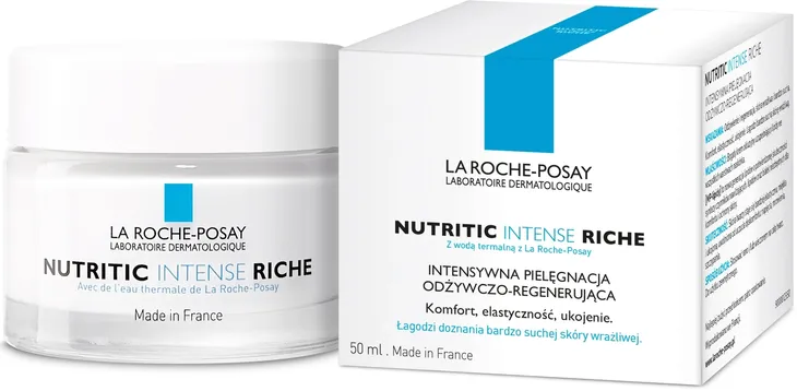 La Roche-Posay Nutritic Intense Riche 50 ml — intensywnie odżywczy krem do bardzo suchej i wrażliwej skóry. Formuła bogata w składniki nawilżające i kojące natychmiast przywraca komfort, redukuje napięcie oraz minimalizuje uczucie ściągnięcia. Produkt został opracowany z myślą o skórze skłonnej do suchości, wymagającej odżywienia oraz wzmocnienia bariery ochronnej.Krem zawiera składniki o silnym działaniu odżywczym i emolientowym, które pomagają zregenerować cerę i zapobiec utracie wody. Lekka, a jednocześnie bogata konsystencja szybko się wchłania, pozostawiając skórę miękką, gładką i przyjemną w dotyku, bez efektu tłustej warstwy. Produkt jest odpowiedni do codziennej pielęgnacji twarzy i szyi, szczególnie w okresach zwiększonego przesuszenia (zima, suche pomieszczenia).Klinicznie przebadana formuła, stworzona z myślą o skórze wrażliwej, minimalizuje ryzyko podrażnień. Produkt hipoalergiczny i bezzapachowy, zaprojektowany tak, by działać skutecznie przy jednoczesnym poszanowaniu delikatnej skóry.Sposób użycia: stosować rano i/lub wieczorem na oczyszczoną skórę twarzy i szyi. Delikatnie wmasować do całkowitego wchłonięcia. Regularne stosowanie poprawia nawilżenie, komfort i wygląd skóry.Pojemność: 50 ml. Idealny dla osób poszukujących intensywnej pielęgnacji dla suchej i wrażliwej cery.