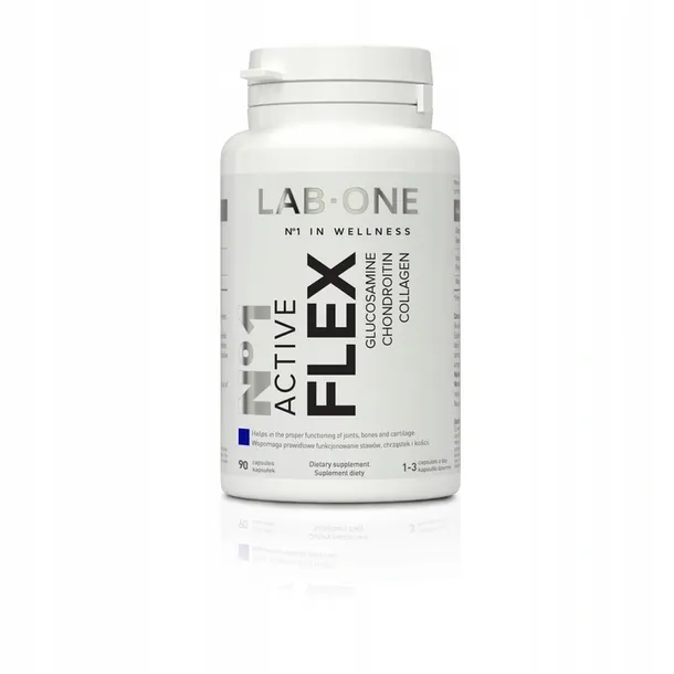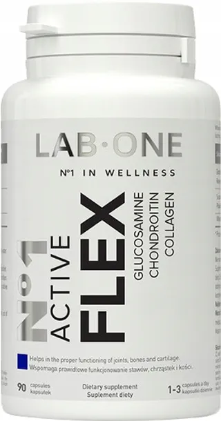 Suplement diety LAB ONE N°1 Active Flex 90 kapsułek to produkt zawierający 8 składników - glukozaminę, chondroitynę, witaminę C, hydrolizowany kolagen typu II, ekstrakt z imbiru, ekstrakt z ostryżu, kwas hialuronowy oraz mangan w wygodnej formie kapsułki.
