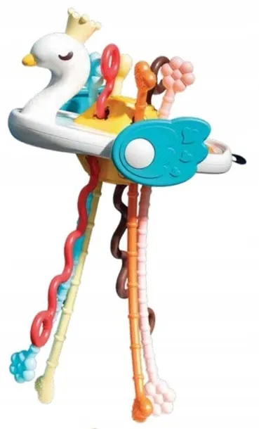 Urocza zabawka, która kryje w sobie niespodzianki, stymulujące zmysł dotyku maluszka! Łabędź wyposażony jest w linki do przeciągania, różniące się kolorem, kształtem i fakturą, skrzydełka z wypustkami, a także kropeczki do wciskania. Kształt zabawki z pewnością przypadnie do gustu młodym poszukiwaczom sensorycznych przygód!