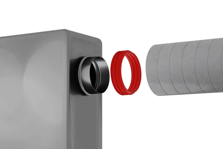 Adapter zakładany jest na zewnętrzną część króćca rekuperatora i chowa się całkowicie wewnątrz podłączanego kanału. Dzięki temu nie wpływa na całkowitą długość instalacji, co ma kluczowe znaczenie, gdy jest ograniczona ilość dostępnego miejsca.