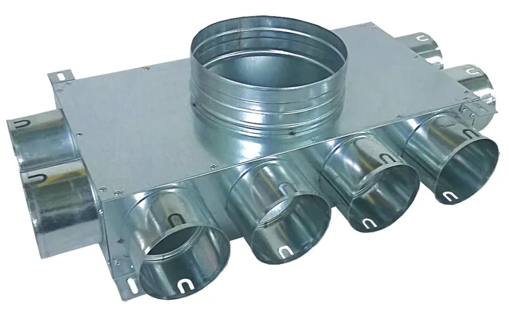 Rozdzielacz dzięki specjalnym kierownicom, płynnie przejmuje powietrze dostarczone głównym przewodem (⌀ 160 lub ⌀200mm) a następnie równomiernie kieruje je w stronę wyjść. Takie rozwiązanie zapewnia identyczne rozprowadzenie powietrza do przewodów (⌀60 lub ⌀75mm) dzięki czemu w każdym pomieszczeniu mamy jednakowy dopływ powietrza. Jest to ogromnie ważne do prawidłowego działania całego systemu.