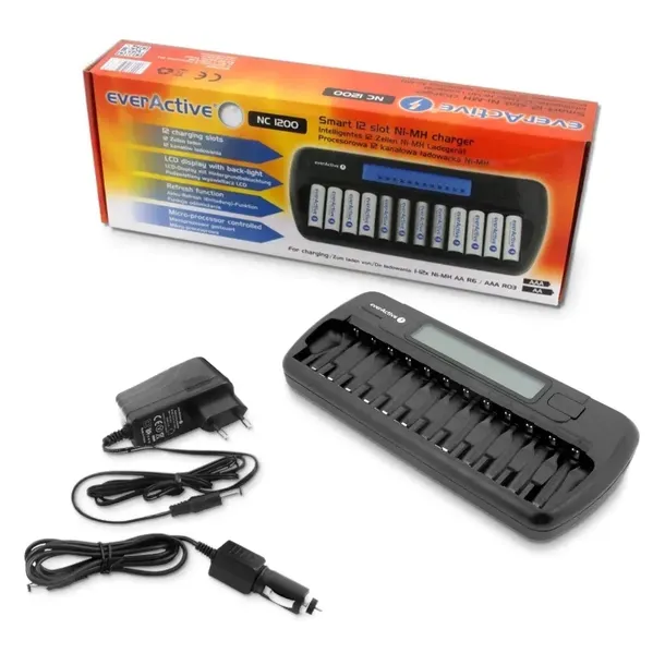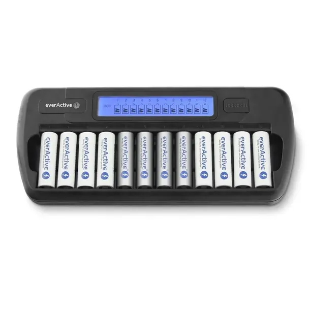 Ładowarka everActive NC 1200 posiada aż 12 niezależnych kanałów ładowania do akumulatorów Ni-MH w rozmiarach R6/AA lub R03/AAA, każde ogniwo jest ładowane indywidualnie.
