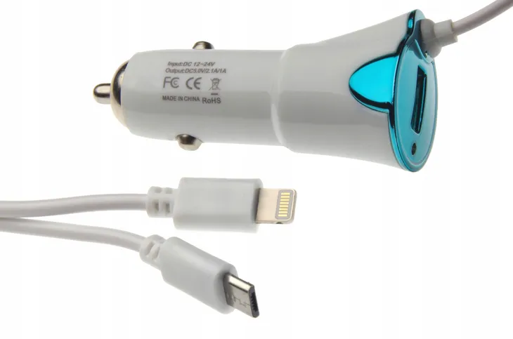 Ładowarka samochodowa USB, microUSB, iPhone Lightning 2.1A + 1.0A