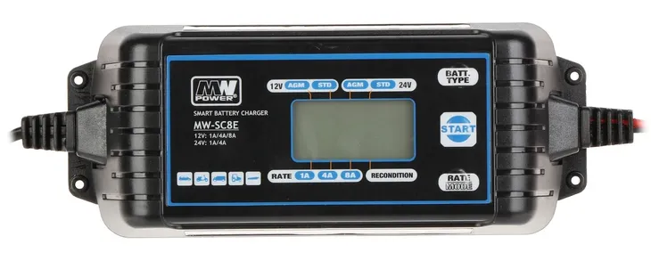 Inteligentna ładowarka akumulatorów MW-SC8E, przeznaczona jest do ładowania akumulatorów kwasowo-ołowiowych, żelowych oraz AGM stosowanych w samochodach, quadach, łodziach, kosiarkach, motocyklach, motorowerach, itp. Sterowanie procesorowe zapewnia w pełni automatyczny, wieloetapowy proces ładowania i umożliwia utrzymanie akumulatora w stanie naładowanym.
