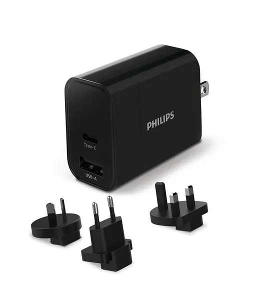 PHILIPS 1xUSB 1XUSB-C PD QC 30W czarna z wymiennymi wtyczkami EU US AU UK