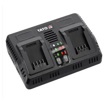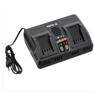 Szybka, podwójna ładowarka wszystkich akulmulatorów systemu 18 V YATO. Wbudowany system testowania sprawności akumulatora oraz temperatury dba o żywotność baterii. Nie podejmuje ładowania, kiedy ogniwa są zbyt rozgrzane. W przypadku baterii przechowywanej w ujemnej temperaturze rozpoczyna ładowanie, gdy bateria osiagnie temperaturę powyżej +5 stopni Celsjusza.