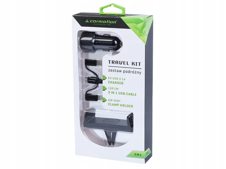ZESTAW PODRÓŻNY: ŁADOWARKA 2X USB 3.1A + KABEL 3W1: MICRO USB / LIGHTNING / USB-C + UCHWYT ZACISKOWY NA WLOT POWIETRZA
