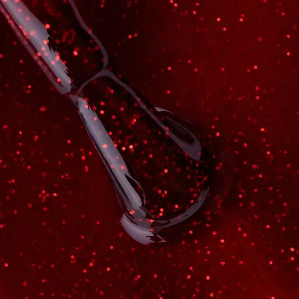 Lakier hybrydowy Kissmas to jasna czerwień z mocnym brokatem — klasyka w świątecznym stylu.