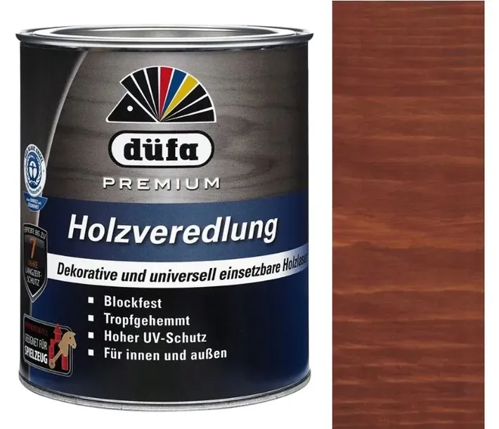 Dekoracyjna lazura uniwersalna do wykonywania ochronnych powłok na wszystkich podlegających odkształceniom i stabilnych elementach drewnianych wewnątrz i na zewnątrz. Idealna do trwałego, dekoracyjnego pokrywania mebli, boazerii, paneli ściennych, okładzin drewnianych, drewnianych okien i drzwi, bram drewnianych, okiennic oraz wielu innych elementów. Nadaje się szczególnie do stosowania w obszarach wrażliwych szczególnego zastosowania jak szpitale, szkoły, przedszkola, hodowle zwierząt itp. Nie nadaje się do malowania parkietów i desek podłogowych. Sucha powłoka jest sprawdzona zgodnie z normą DIN EN 71.3 pod względem odporności na pot i ślinę. Tym samym düfa Holz Veredlung nadaje się również do lakierowania zabawek dziecięcych. düfa Holz Veredlung jest wyróżniona nagrodą Blauer Engel [Niebieski Anioł].