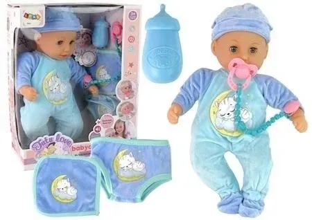 Lalka Bobas Dźwięk Smoczek Śliniaczek Niebieska Piżama Kotek Urocza lalka bobas zachwyci malucha. Zabawa będzie niezwykłym doświadczeniem, nauczy odpowiedzialności i empatii. Wymiar edukacyjny lalki zaprocentuje w przyszłości i pomoże wczuć się w ważną rolę, jaką jest opieka nad drugą osobą. Twoje dziecko uwielbia naśladować swoje kochające, troskliwe i opiekuńcze mamusie. Lalka ubrana jest w piękną, niebieską piżamkę ze śpiącym kotkiem na środku. Na głowie bobasa znajduje się czapeczka. Do zestawu dołączony jest różowy smoczek i butelka do picia w niebieskim kolorze. Akcesoria z ubrań to śliniaczek i majteczki z kotkiem. Całość idealnie pasuje do siebie i wygląda wprost uroczo. Lalka ma ruchome ręce i nogi oraz główkę. Można ją umieścić na siedząco lub leżąco. Ubranko jest zdejmowane, co pozwoli na wymianę garderoby. Dzięki funkcjom, takim jak ruchome powieki, a także odgłosy ssania smoczka i snu sprawiają, że zachowuje się jak prawdziwe dziecko. Wystarczy włożyć buteleczek do ust maluszka, a usłyszysz charakterystyczny dźwięk. Prezentowana lala wykonana jest z twardej gumy, która świadczy o bezpieczeństwie płynącym z jej użytkowania, a także długiej żywotności zabawki. Elementy zestawu: - laleczka bobas - smoczek - butelka - śliniaczek - majteczki Długość lalki: 38 cm Wymiary pudełka: 36 cm x 28 cm x 14 cm Lalka przeznaczona jest dla dzieci powyżej 3 roku życia. Zabawka posiada certyfikat CE i jest zgodna z normą EN 71. Bobas zapakowany jest w kolorowe pudełko z przezroczystą witrynką, dzięki czemu nadają się na prezent dla dziecka. Baterie znajdują się w głośniku na brzuszku bobasa. Zasilany trzema bateriami AG13, w zestawie.