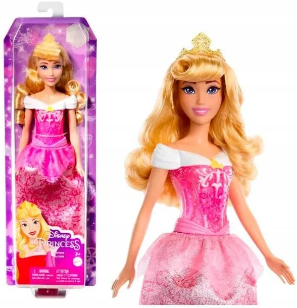 Disney Princess. Lalka Aurora podstawowa HLW09Przedstawiamy lalkę Aurorę inspirowaną pełną pozytywnej energii i kreatywności księżniczką z filmu \Śpiąca królewna\ Disneya. Ta lalka do ustawiania w różnych pozach ma mieniący się strój i akcesoria, na które składają się buciki i tiara. Ubrana w swoją kultową stylizację z filmu Aurora jest gotowa na każdą przygodę! Lalka nie stoi samodzielnie. Kolory i elementy dekoracyjne mogą się różnić.
