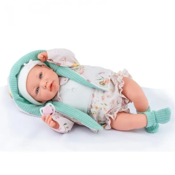 Pięknie ręcznie wykonany bobas 1214 pochodzi z hiszpańskiej kolekcji marki Marina & Pau. Dziewczynka o imieniu Ane Mint ma 45 cm wysokości. Lalka wizualnie przypomina prawdziwego bobasa. Dziewczynka nie ma włosów, a jedynie żłobienia wyglądające niczym jak u noworodka.