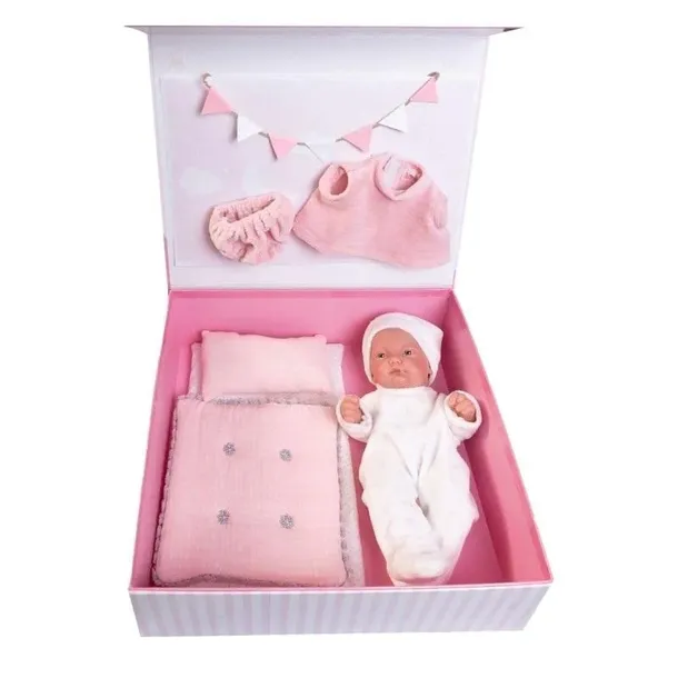 Hiszpański bobas ma duże niebieskie oczy, zaś na główce nie posiada włosków, jedynie występują rzeźbienia imitujące delikatne włoski, które wyglądem przypominają jak u prawdziwego noworodka. Bobas jest niewielki, dlatego sprawdzi się na wszelkie wyjścia oraz przyjęcia do rodziny czy wyjazd wakacyjny. Słodkie maleństwo od dziś będzie towarzyszyć gdziekolwiek pójdziesz. W asortymencie lalek Antonio jest wiele różnych Pitusów ile jest prawdziwych dzieci, więc znajdziesz odpowiedni model dla siebie w pięknych stylizacjach z uroczymi dodatkami.