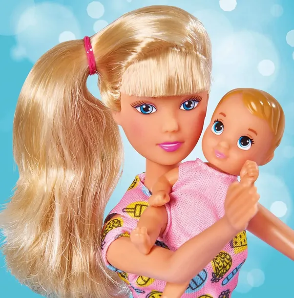 Steffi na długie blond włosy, ubrana jest w różową bluzeczkę drukowaną w żółto-niebieskie wzorki, niebieską spódniczkę i różowe buciki. Steffi opiekuje się małym bobaskiem ubranym w różowe body. Bobasek pluska się w basenie ze zjeżdżalnią, a żeby zabawa była bezpieczna ma dmuchane koło w kształcie gwiazdki.