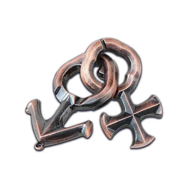 Łamigłówka składa się z dwóch splecionych symboli. Celem jest rozplątanie ich bez zginania lub łamania, co wymaga logicznego myślenia i zręczności.
