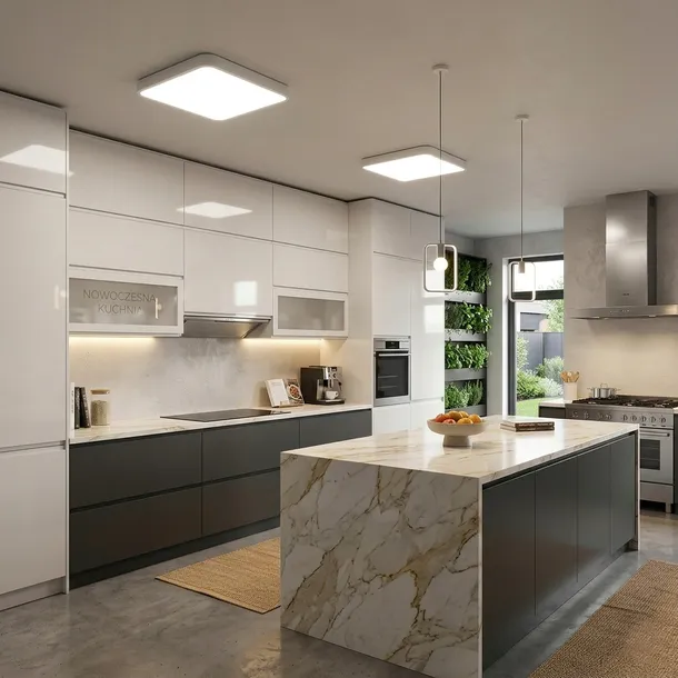 - Minimalistyczna, biała, kwadratowa lampa – efektowny design do nowoczesnych wnętrz.
