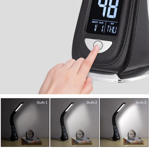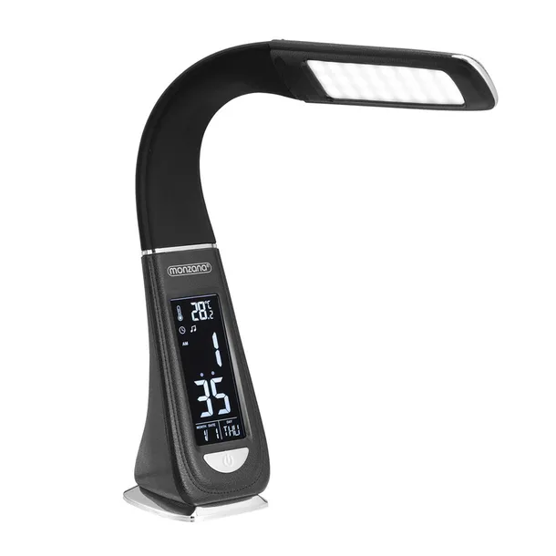Główkę lampy można obracać i przechylać w różnych kierunkach, dzięki czemu można jej również używać jako lampy do czytania.Wbudowany wyświetlacz nie tylko wyświetla czas z opcją budzika, ale również datę i temperaturę. Lampa posiada 3 różne poziomy jasności, które można dostosować do własnych potrzeb.Stopka pokryta jest antypoślizgowym materiałem, który również powierzchnię stołu przed zarysowaniami.Dodatkowa bateria sprawia, że czas i data nie muszą być wprowadzane ponownie jeśli lampa zostanie odłączona od przewodu zasilającego na krótki czas.