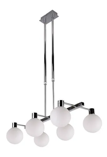 Maldus Rectangle 6- lama sufitowa w kształcie prostokąta z sześcioma kulami z mlecznego szkła, mocowanie do podsufitki na chromowanych rurkach z możliwością skracania.