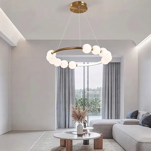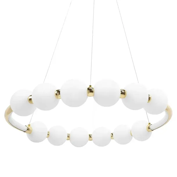 Nowoczesna lampa LED o niebanalnym kształcie opartym na okręgu z mlecznobiałymi kloszami to propozycja, która zachwyca formą i funkcjonalnością. Kule rozpraszające światło równomiernie oświetlają wnętrze, nie rażąc oczu i tworząc przyjazną atmosferę. Złote akcenty dodają jej szyku i wnoszą do aranżacji subtelny element luksusu.