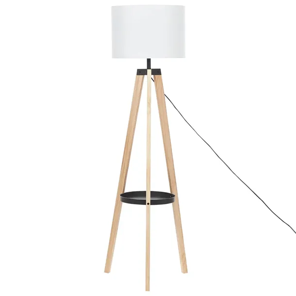 Lampa stojąca, która będzie nie tylko niezbędnym oświetleniem twojego domu, ale także elementem dekoracyjnym. Ciekawa forma trójnogu zakończona klasycznym, lnianym abażurem będzie pasować do wnętrza urządzonego nowocześnie lub w stylu minimalistycznym. Całości dopełnia dodatkowa półka na drobiazgi znajdująca się między nóżkami lampy.Parametry: