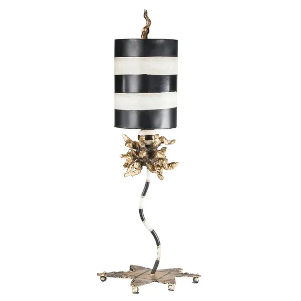 Lampa stołowa Dominique to wyjątkowe dzieło inspirowane sztuką i atmosferą Nowego Orleanu. Jej podstawa i cylindryczny klosz przykuwają wzrok, pomalowane w efektowne czarno-kremowe paski, które harmonijnie współgrają z dekoracyjnymi elementami w złotym odcieniu. To nie tylko źródło światła, ale także wyraz artystycznej kreatywności, dodające elegancji i unikalności każdemu wnętrzu.