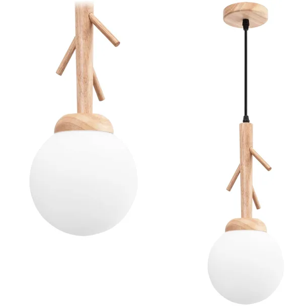 Lampa Sufitowa Wisząca Drewniana Naturalna Szklany Biały Klosz Boho