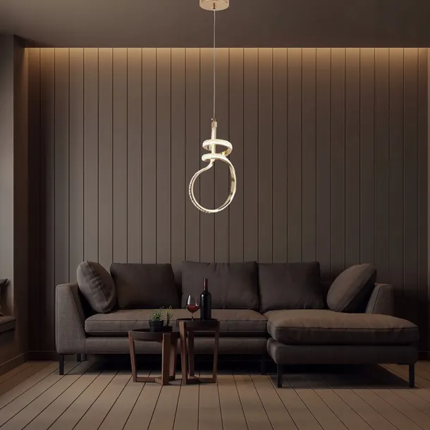 Złota lampa LED o spiralnej formie to wyjątkowe oświetlenie dekoracyjne, które z powodzeniem zastąpi tradycyjny żyrandol. Dynamicznie skręcony korpus oraz subtelne kryształowe zdobienia nadają jej wyrazistości i luksusowego charakteru.