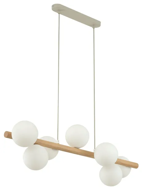Oprawa wykonana w stylu nowoczesnym, dzięki czemu dopasuje się do każdego wnętrza. Lampa może być użyta praktycznie w każdym pomieszczeniu, począwszy od pokoju dziennego do sypialni. Lampa wisząca została wykonana z metalu w kolorze białym oraz rewna w kolorze brązowym. W zestawie znajdują się klosze wykonane ze szkła w kolorze białym. Oprawa przystosowana na siedem żarówek G9 max. 6W. Produkt nie zawiera wbudowanego ściemniacza światła. Oprawa z możliwością regulacji wysokości. Produkt sprzedawany jest bez żarówek.