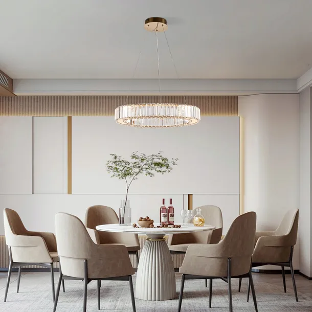 ✅ Kiedy nowoczesna forma spotyka się z kunsztem wykonania, powstaje niezwykła lampa wisząca Wobako APLI R50. Wyposażona w trzy tryby świecenia – ciepły, neutralny i chłodny – umożliwia dopasowanie światła do nastroju i charakteru pomieszczenia. Każdy kryształ tej lampy został precyzyjnie oszlifowany niczym diament tworząc efekt biżuteryjnego blasku. Połączenie kryształowej konstrukcji ze złotą, lśniącą stalą nierdzewną oprawy daje wyjątkowy, luksusowy efekt, który przyciąga spojrzenia i wprowadza do wnętrza aurę elegancji.